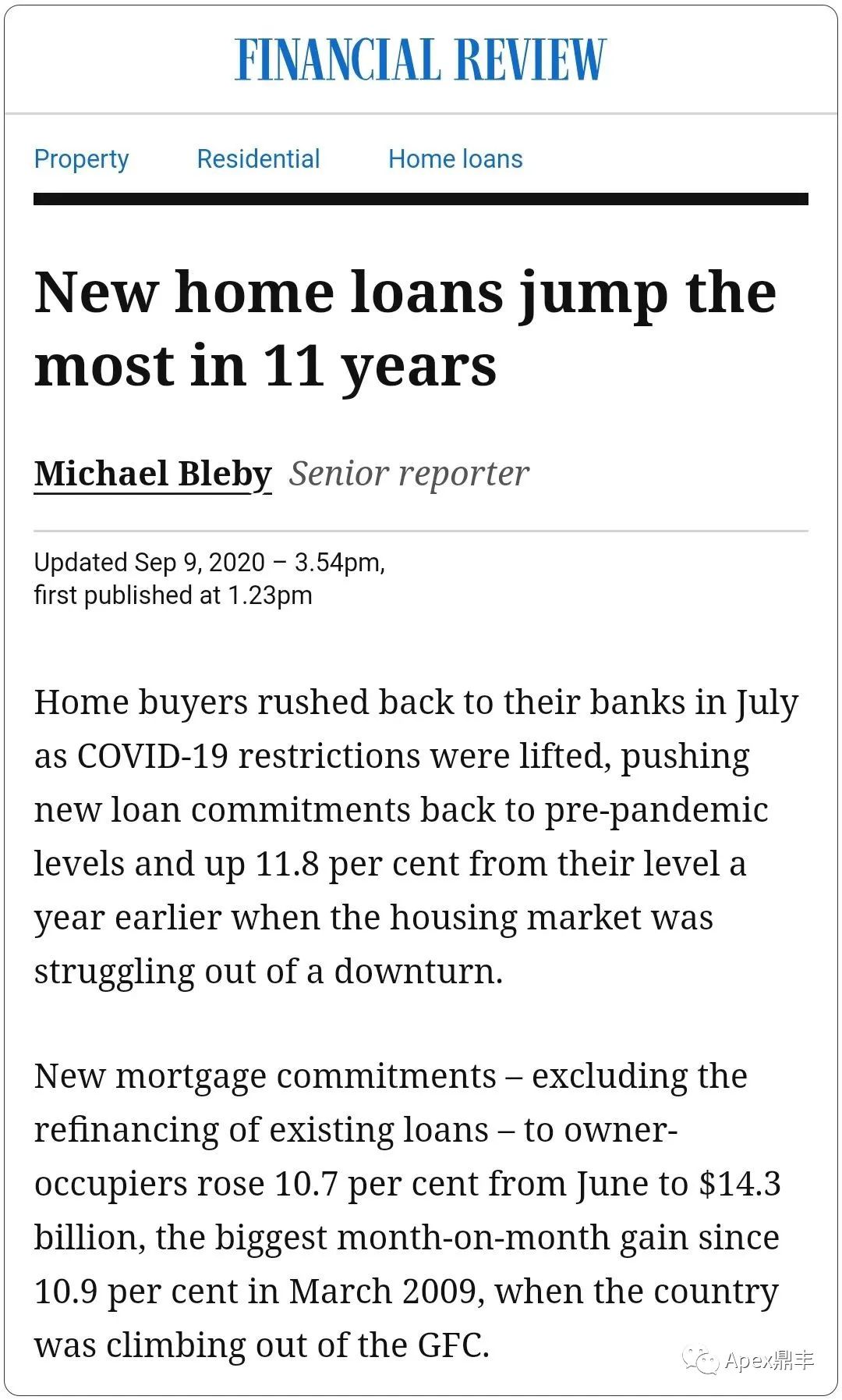 新的自住房贷,排除已有贷款的重组,从6月涨了10.7%到143亿澳元,这是2009年3月以来最大的单月增幅,当时澳洲正在努力摆脱全球金融危机!同时首次置业者的房贷从金额来看也增加了10.6%!新的投资房贷款,排除重组贷款,则在7月增加了3.5%,新的CBA报告显示:随着低利率吸引买家回到房市,房价预计将从明年中反弹,之后会从顶峰价格小幅下降!RBA的降息会推高房贷的需求,推高房价,所以房市周期会领先于经济,而非经济引领房市!到明年12月底CBA预计悉尼房价上涨2.9%。