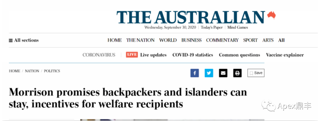 莫里森承诺,会为背包客、太平洋岛民以及,季节性员工延长签证期限,方便他们在澳停留更长时间。新的签证政策变更将包括取消打工度假签证30岁的年龄限制,这样31岁及以上的人也可以在澳洲从事农业工作。此外政府还将激励领取福利金的人及大学生,在农场工作。新变更还包括在福利补贴被削减之前,JobSeeker领取者和青年津贴领取者可以从事农业工作,每两周可以从农民那里赚取最多300澳元。政府也在重新开放季节性工人计划和太平洋劳工计划,以引进太平洋地区的工人,填补偏远地区的工作缺口。