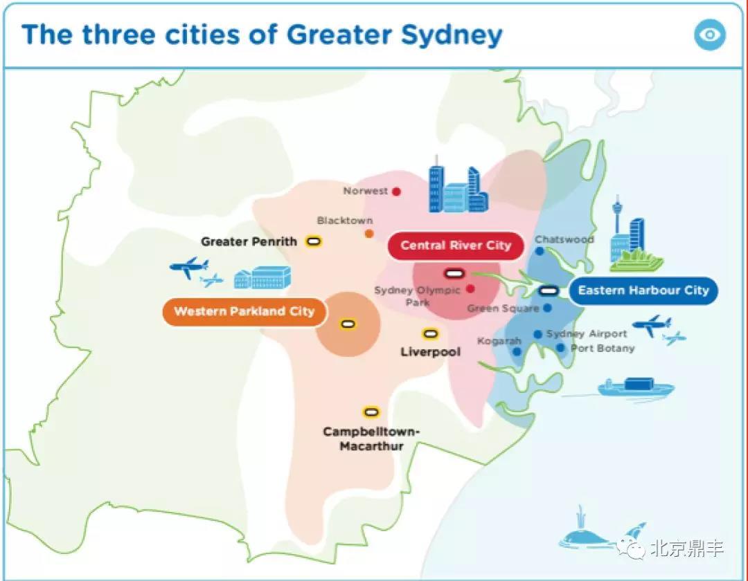 新南威尔士州政府公布的未来四十年规划中,将大悉尼划分为三大板块,分别是以现悉尼市区为中心的东部海港城市板块(下图蓝色),Parramatta市为中心的河岸城市板块(下图红色),以及悉尼第二机场航空城为中心的西部园林城市板块(下图橙色),且于各板块设立数个重点商业城镇。