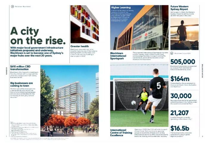 Blacktown市政区是大悉尼未来二十年规划中的其中一个重点发展的商业枢纽区,1.64亿澳元的政府基建项目在案进行,包括中央商务圈交通网、商厦项目、国际级体育城等等。预计至2036年Blacktown常住人口从36万增加至50.5万,新增就业岗位3万个。